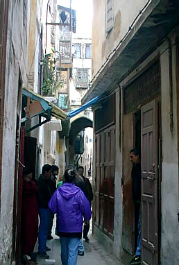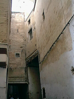 After talking to a few people about guiding us, we went with a man named Said, a Berber who acted in the most straightforward and casual manner. He led us through a dizzying array of ancient monuments, markets, and picture-taking spots. He walked quite fast, though, and it was hard to keep up with him on the uneven and crowded streets. Said invited us to his home for a little "Berber hospitality": hot mint tea and a cool respite. It was also a wonderful opportunity to see what's beyond those shadowy and oppressive walls. After stooping through the small door and entering the cool darkness of the home, we were led to a livingroom-type area with cushioned seats lining the walls. From there I could see into a very small room where his sister was sitting on the floor squeezing oranges for juice, and his father secretly peering down on us from the living quarters upstairs. After looking at Said's picture album he offered to take us to eat some "real Berber food." "Great!" we thought, but in retrospect this is when things began to fall apart. Said took us to a very beautiful restaurant -- it's funny, because most things in the Medina look fairly old and decrepit, but after turning a couple of corners we found ourselves in a building that sparkled with exquisite Arabesque design and traditional Moroccan decoration. Unfortunately, the restaurant was expensive and touristy, and the food not all that tasty, and ultimately we wished we had not eaten there. | ![]() |